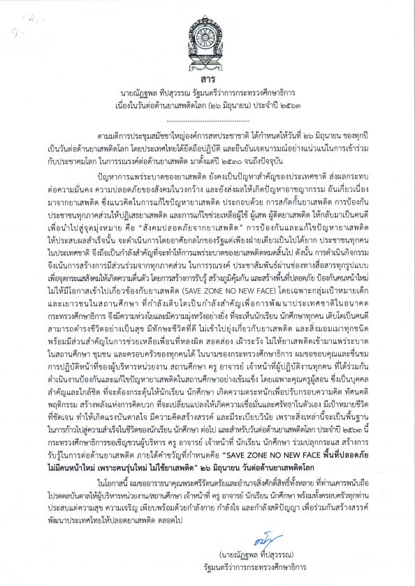 วันต่อต้านยาเสพติดโลก (26 มิถุนายน พ.ศ. 2563) 26 มิ.ย. 2020adminข่าวประกาศล่าสุด วันต่อต้านยาเสพติดโลก (26 มิถุนายน พ.ศ. 2563) สารจาก รัฐมนตรีว่าการกระทรวงศึกษาธิการ เนื่องในวันต่อต้านยาเสพติดโลก 26 มิถุนายน 2563 FacebookFacebookXXLINELine