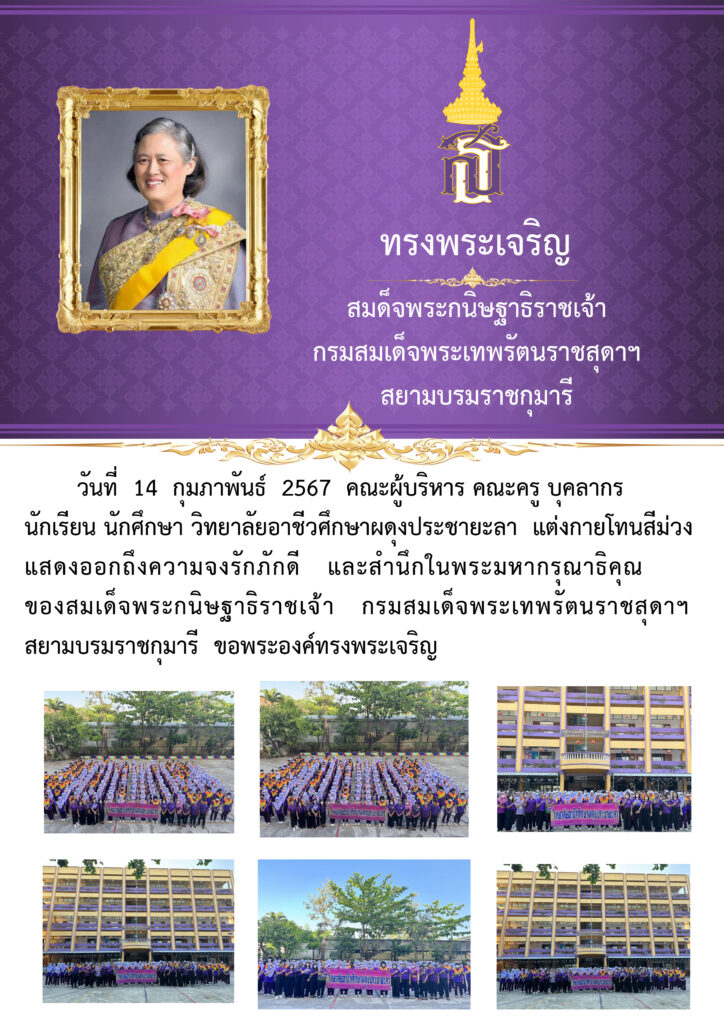 วันที่ 14 กุมภาพันธ์ 2567 คณะผู้บริหาร คณะครู บุคลากร นักเรียน นักศึกษา วิทยาลัยอาชีวศึกษาผดุงประชายะลา แต่งกายโทนสีม่วง แสดงออกถึงความจงรักภักดี และสำนึกในพระมหากรุณาธิคุณ ของสมเด็จพระกนิษฐาธิราชเจ้า กรมสมเด็จพระเทพรัตนราชสุดาฯ สยามบรมราชกุมารี ขอพระองค์ทรงพระเจริญ